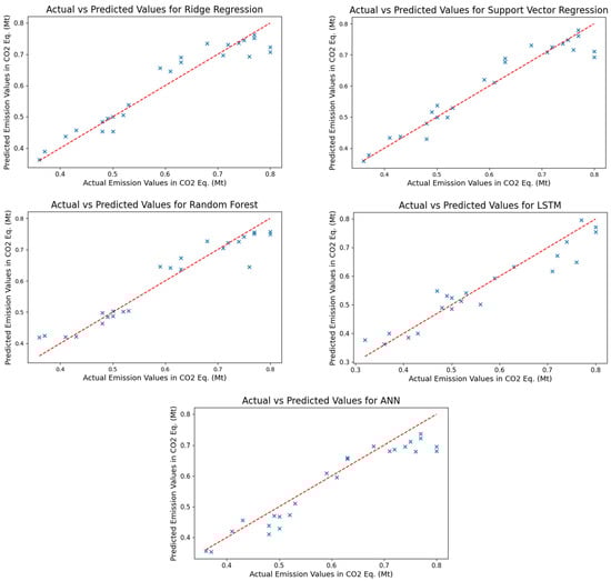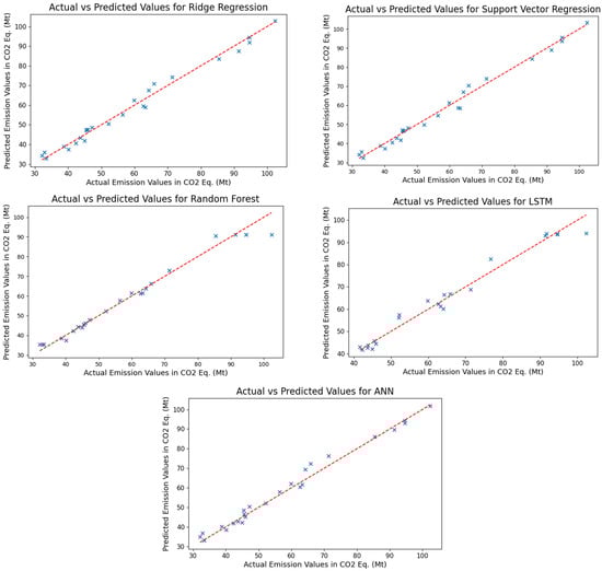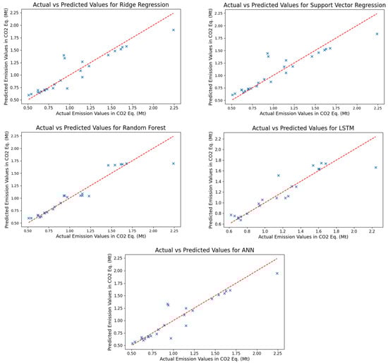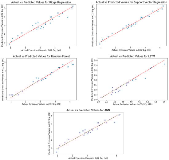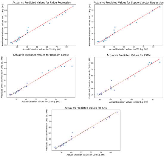 As demonstrated by the training results in relation to the total transport emissions, it can be observed that the predicted values obtained via the support vector regression algorithm show a high degree of proximity to the actual values. Furthermore, the ridge regression and ANN models exhibited better performance in comparison to the random forest and LSTM models. An examination of the results obtained from the models employed on the test dataset reveals that all models yielded values greater than 0.96, in terms of the R