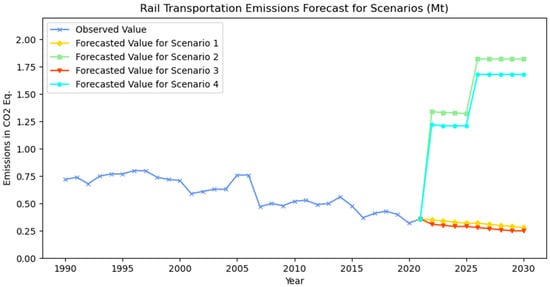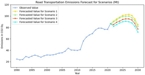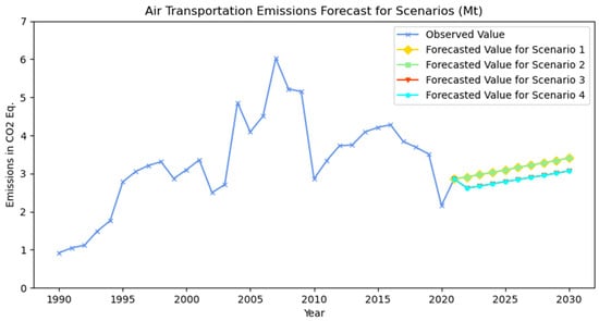 5] establishes sectoral strategies and actions. Accordingly, the following strategies have been defined for the transport sector: the promotion of a modal shift to marine/rail transportation, the enhancement of transport sector efficiency, the utilization of sustainable/clean energy sources in transport systems, and the undertaking of infrastructure activities deemed necessary for the decarbonization of the sector. In order to make future projections for transportation-related emissions, four scenarios have been defined, taking into consideration the emission mitigation strategies of the ministry. Scenario 1 is regarded as the baseline scenario, and it is hypothesized that the input parameters for each transport mode will demonstrate a similar trend to those observed in the past. In Scenario 1, future values of the input parameters are estimated based on their past values, using the exponential smoothing method. In Scenario 2, a gradual modal shift from road to marine and rail transport of up to 2% is assumed. Scenario 3 focuses on analyzing energy efficiency across all modes of transport. It is assumed that in Scenario 3, although the input parameters will show an increasing trend similar to that observed in the past, energy efficiency (when energy savings between 10% to 20% are reached) will be achieved for all modes of transport. Finally, Scenario 4 represents a combination of a gradual shift to marine and rail transport, as defined in Scenario 2, and the achievement of energy efficiency in all transport modes, as described in Scenario 3. The development of scenarios concerning the utilization of sustainable and clean energy sources in transport systems, in addition to the infrastructure strategies necessary for the decarbonization of the sector, was not possible due to a lack of data. The future projection results for the road, air, marine, and rail transportation modes for defined scenarios in terms of CO