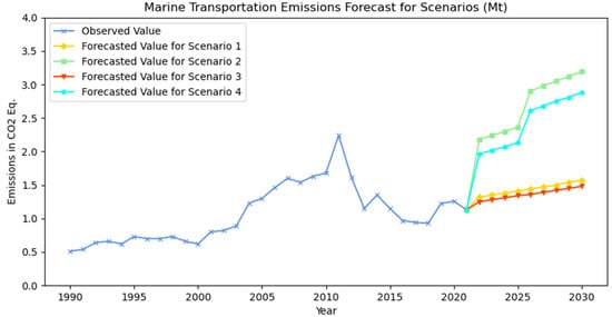 Based on findings of future projections of marine transport, a slight increase in emissions from marine transport is observed in Scenario 1; conversely, a significant increase in emissions is observed when the modal shift from road transport is considered in Scenario 2. A decline in the rate of increase in emissions is evident upon considering the decrease in energy consumption in Scenario 3; nevertheless, a marked upward trend emerges in Scenario 4 in conjunction with that of Scenario 2. It should be noted that the increase in Scenarios 2 and 4 is significantly more minimal in comparison to the potential increase in the case of road transportation.