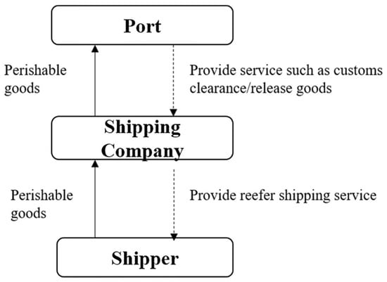 In this paper, we consider a maritime supply chain with perishable goods, consisting of a port, a shipping company, and a shipper, as shown in Figure 1. The solid lines in Figure 1 represent the flow of goods, where the shipping company transports perishable goods from the shipper to the port. The dashed lines indicate the services provided by the port and the shipping company: the port offers services such as customs clearance and cargo release to the shipping company, while the shipping company provides reefer shipping services to the shipper.