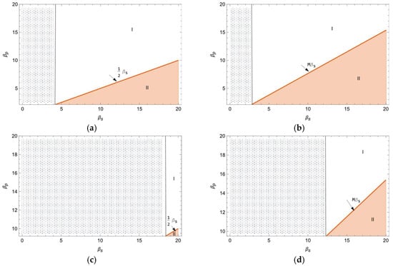 When the port is the decision subject, as shown in Figure 5a,c, regionⅠrepresents , then the optimal strategy of the port is that the shipping company invests in BCT, which can obtain higher profits, while region II represents , and the optimal strategy of the port is that the port itself invests in BCT. When the shipping company is the decision subject, as shown in Figure 5b,d, region I represents , then the optimal strategy of the shipping company is to invest in BCT by itself; region II represents , then the optimal strategy of the shipping company is the port investing in BCT. In addition, further analysing the effect of the perishable goods loss rate on the optimal strategy, comparing Figure 5a,c, the proportion of region II decreases with an increasing perishable goods loss rate. This means that the port’s optimal strategy prefers the shipping company to invest in BCT with the perishable goods loss rate increasing. Figure 5b,d also show the same trend. This may be due to the fact that as the perishable goods loss rate increases, shipping companies are able to improve the customs clearance efficiency by investing in BCT, reduce the quantity loss of perishable goods in the process of waiting for customs clearance, and ultimately increase the port profits and their own profits; the profit advantage of shipping companies investing in BCT becomes more significant when the perishable goods loss rate is high.