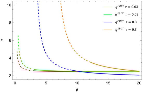 Figure 6 and Figure 7 demonstrate the effect of the BCT investment cost coefficient on market demand and the profit of the port and shipping company under model PBCT and SBCT with different perishable goods loss rates. The dashed portion in these figures indicates that the BCT investment cost coefficient does not reach profitable solutions.
