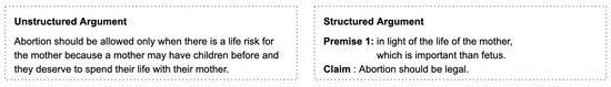Usually, an argument comprises one claim and a single or many premises to support that claim. Formally, this structure can be referred to as a forecast argument, and, as explained in Section 2.2, it is a tentative defeasible inference that links premises to claims. However, in the real world, an argument’s structure is unlike in this format in terms of a claim, with its premises being written or spoken together. Hence, existing research focuses on extracting claims and premises from natural language text, finding their relations and providing a suitable structure to an argument for further analysis [63]. An example of an unstructured argument vs a structured one can be seen in Figure 3. Natural language arguments help us understand their subjective meaning and context, facilitating a human assessment of their DQI value. Most research studies focus on the dimensions and factors of deliberation quality but not the structure of arguments or dialogues. For these reasons, the web interface was developed to facilitate participants to present their natural (unstructured) arguments. However, to prepare arguments for subsequent computations, a tool was added to convert such natural arguments into structured ones. In detail, participants were asked to use lexical discourse indicators, which were used to label the arguments in the persuasive essays dataset [64], such as ‘because’, ‘although’, ‘however’, and many more, to perform the conversion and help to relate the premises with their claims. In a nutshell, unstructured arguments are raw and natural, allowing participants to express them subjectively. In contrast, structured arguments are built with existing linguistic indicators facilitating the identification of premises and allowing a clear link to one of the defined claims; in this case, whether abortion should be legal or not. Participants can create as many forecast arguments as they wish.