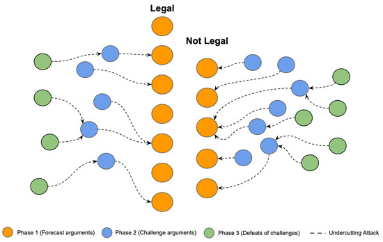 A set of arguments S is admissible if and only if it is conflict-free and can defend itself. Let (Ar, attacks) be an argumentation framework, and let . A set of S arguments is said to be conflict-free if there are no arguments in S such that A B. In the literature of argumentation theory, three types of conflict are usually formalized: rebutting, undermining, and undercutting [41,42]. A rebutting attack is when an argument negates the conclusion of other arguments [26,43]. In an undermining attack, an argument can attack one of its premises by another whose conclusion refuses those premises [26,43]. An undercutting attack occurs when an argument uses a defeasible inference rule and is attacked by arguing that a particular case does not allow for the application of that inference [44]. When an argumentation framework is shaped, its topological structure is often examined to extract conflictual information and create conflict-free argument partitions of acceptable arguments [45,46]. Acceptability semantics can be defined in terms of extensions [8] following different principles: