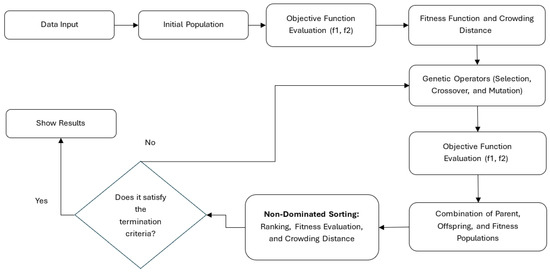 Figure 5 outlines the main steps of a multi-objective genetic algorithm (e.g., NSGA-II). First, data input is used to create an initial population of candidate solutions. Each solution is then evaluated against the objective functions (f1, f2), and a fitness function and crowding distance are calculated. Based on these measures, genetic operators (selection, crossover, and mutation) generate new offspring. Next, non-dominated sorting sorts the answers by the level of dominance and the distance between the solutions, combining the parent and offspring populations. The algorithm checks whether a termination criterion (such as a maximum number of generations or a convergence threshold) is met. If not satisfied, it continues iterating. Otherwise, it shows the final results, which ideally form a set of non-dominated (Pareto-optimal) solutions.