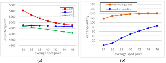 Influence of spot price on the performance of the procurement strategies. (a) Spot price vs. expected profit; and (b) spot price vs. optimal option quantity.