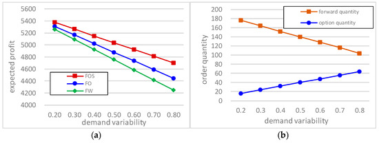 Effect of different demand variabilities on procurement strategies. (a) Demand variability vs. expected profit; and (b) demand variability vs. optimal order quantity.