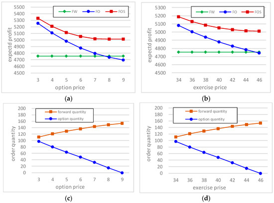 Figure 6a,b illustrate how changes in option price and exercise price affect different procurement strategies. Increases in both option price and exercise price have similar effects on each strategy. As option costs rise, the expected profits of both the FO and FOS strategies decrease. However, the rate of decline is more gradual for the FOS strategy than for the FO strategy. Additionally, the FOS strategy consistently yields higher expected profits than the other two strategies. Figure 6c,d show the optimal order quantity as option price and exercise price change. When the option costs rise, the FW order quantity increases while the option order quantity declines, leading to an overall reduction in total order quantity. This suggests that as option costs rise, procurement shifts towards the spot market, resulting in a decrease in total order quantity. These findings highlight the importance of supply chain managers carefully considering option costs when determining the volume of forward and option contracts.