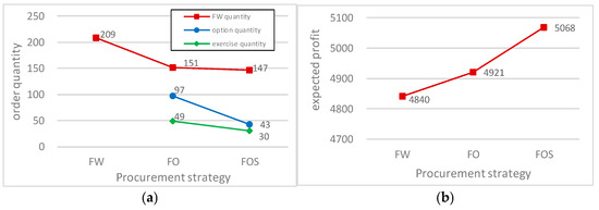 Three procurement strategies are analyzed: forward contract (FW), forward and option contract (FO), and forward, option, and spot market contract (FOS). Figure 2 presents the order quantity and the corresponding expected profit for each strategy. The results indicate that in the FO and FOS strategies, the optimal forward order quantity is lower than in the FW strategy, and the option order quantity in the FOS strategy is smaller than in the FO strategy. Since unmet demand from options can be procured through the spot market, it is reasonable that the option order quantity in the FOS strategy decreases.
