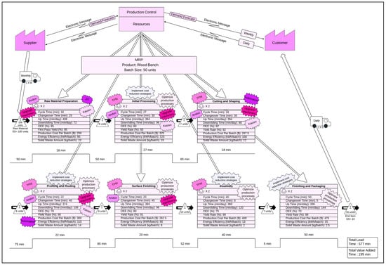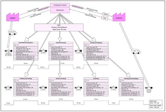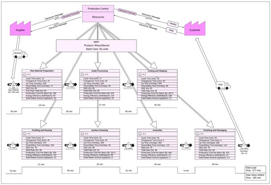 Table 6. The value-added time in the current state improved by approximately 22.05%, decreasing to 152 min in the future state, while the non-value-added time was reduced by 47.64%, bringing it down to 200 min. Additionally, the required number of workers in the wooden park/garden bench production decreased from 14 to 12, representing an improvement of 14.29%. Finally, the total inventory in the system was reduced from 171 to 73 units, achieving an improvement of approximately 57.31% as shown in