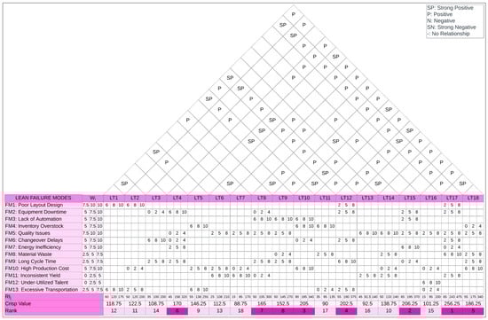 Within the Fuzzy QFD method, the prioritized LFMs are listed in the column. The technical requirement section included the lean tools and techniques that could potentially address the LFMs. In the initial phase, the importance weights of the LFMs were determined. Subsequently, a relationship matrix between the LFMs and lean tools was created. The correlation matrix, which shows the relationship between the selected lean tools is illustrated in
