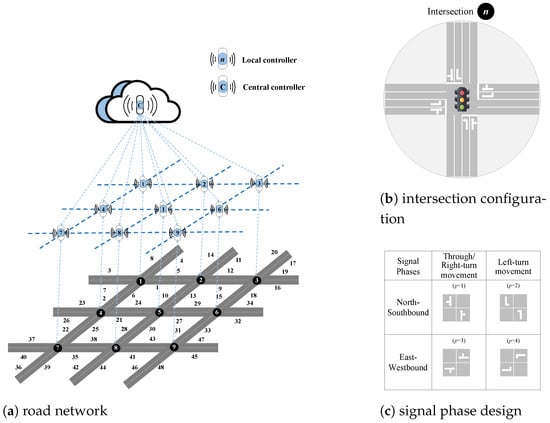 Let N and n () denote the set of intersections and the intersection index in the road network, respectively. p denotes the index of the signal phase, with a pre-determined relationship between p and the traffic movements that are released in phase p. The decision variable represents the green time duration of phase p at intersection n at time step k, which is determined by the difference between the starting times of phase p and , as shown in Equation (14).
