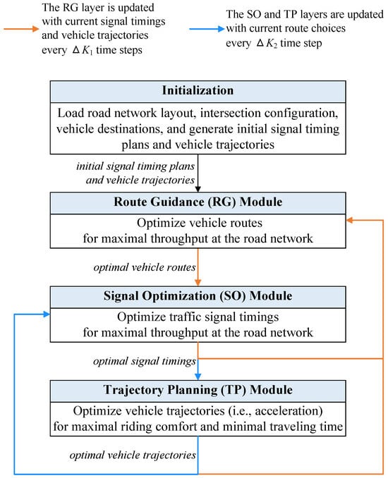 The route guidance module aims to optimize vehicle routes for the maximum throughput of the road network based on the initial/current signal timings and vehicle trajectories. The signal optimization module determines the optimal traffic signals for maximum throughput based on the current results of the other modules. The trajectory planning module optimizes vehicle accelerations to maximize riding comfort (i.e., reduce acceleration fluctuations) and minimize travel time (i.e., stimulate vehicles to travel with the maximum speed).
