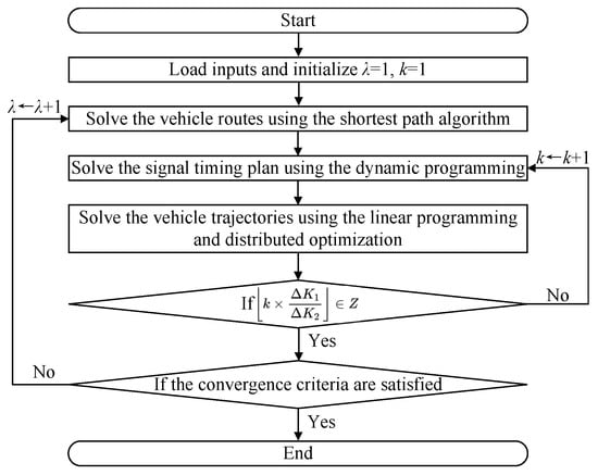 The flowchart in Figure 3 illustrates the iterative optimization process that determines the optimal vehicle routing, signal timing, and trajectory planning at an urban network. The overall solution framework is implemented via MATLAB on a desktop with an Intel(R) Core(TM) i7-11700F CPU with 16 GB memory. The shortestpath and linprog solvers are applied to solve the optimal routes and vehicle trajectories, respectively.