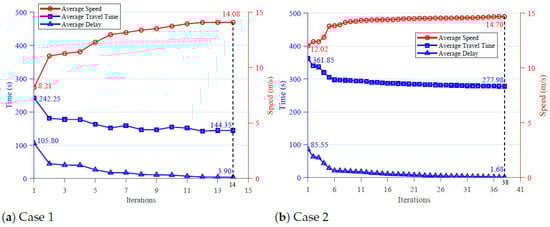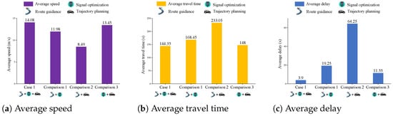 The operational performance is discussed in this section. Cases 1 and 2 are analyzed using performance metrics for the average speed, average travel time, and average delay, as shown in Figure 4. The average speed is calculated by dividing the total vehicle speed over all time steps by the total simulation time. Travel time refers to the duration a vehicle spends traveling through the road network. Vehicle travel delay is defined as the difference between the actual travel time and the minimum possible travel time (i.e., traveling at maximum speed). The average values of speed, travel time, and delay are computed across all vehicles to assess the overall traffic efficiency in the urban road network.