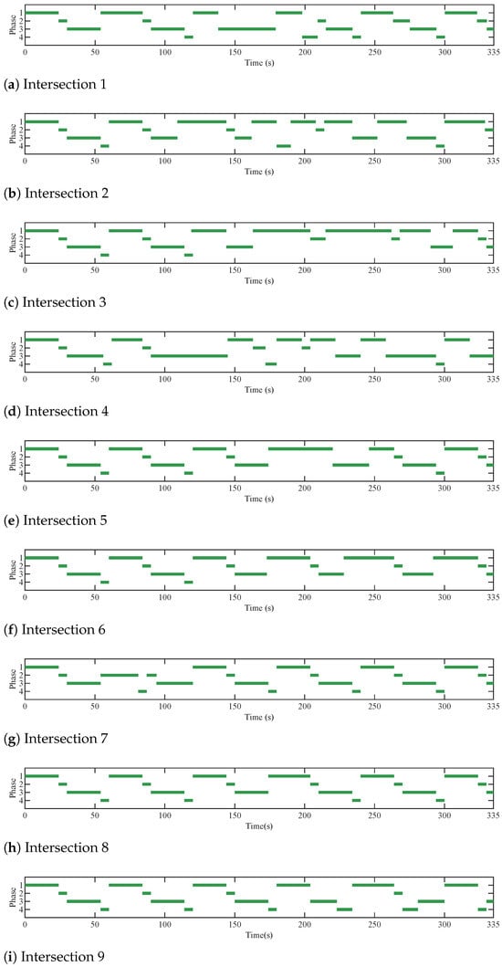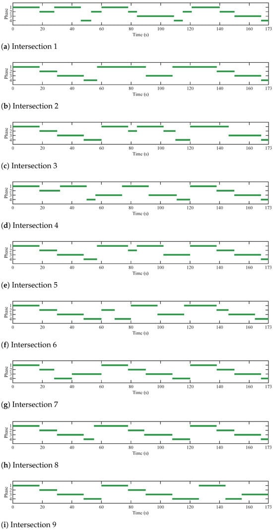 Figure 5 illustrates how the signal optimization module adjusts signal plans in response to dynamic traffic flows, aiming to minimize travel time while adhering to all constraints. The optimal signal performance varies under different traffic demand levels. Under lower traffic demand, the optimal signal durations change only slightly compared to the initial plans, and the signal phase sequences follow a regular sequence from to . For example, in Case 1, the signal plans at Intersection 8 (Figure 5h), at Intersection 7 from 60 s to 180 s (Figure 5g), and at Intersection 9 from 0 s to 126 s (Figure 5i) reflect this regular pattern. In contrast, under higher traffic demand, the optimal signal durations change more significantly, and the phase sequences become irregular. In some cases, phases may be skipped entirely if no vehicles arrive. For instance, at Intersection 1, the signal phase durations from to between 58 s and 138 s differ substantially from the initial plan, as shown in Figure 5a. The optimal signal performance in Case 2, depicted in Figure 6, shows a similar pattern, further demonstrating how the optimization adapts to varying traffic conditions.