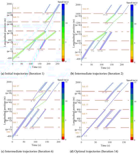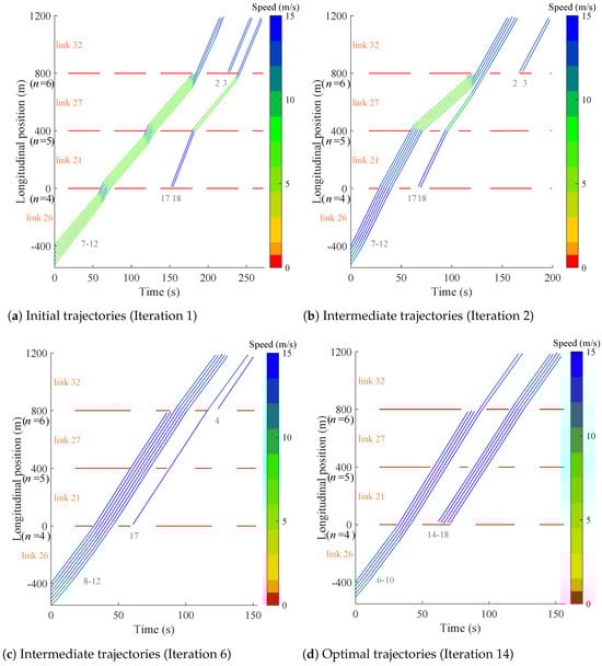 The iterative results for Route 1 are analyzed as follows. The simulation times required for all vehicles to exit the road network at iterations 1 and 14 are 272 s and 156 s, respectively. As the iterations progress, the reduction in simulation time highlights the effectiveness of the proposed optimization framework in significantly reducing travel time by increasing vehicle speeds. At Iterations 6 and 14 (Figure 7c,d), all vehicles pass the intersections without encountering red lights, further contributing to the reduction in total travel time. Vehicle speeds improve significantly when comparing Iteration 1 (Figure 7a) with Iteration 2 (Figure 7b). In Iteration 2, Vehicles 7 to 12, starting from −400 m, reach their maximum speed on Links 26 and 21, resulting in a 60-s reduction in arrival time at Intersection 5, namely dropping from 120 s in Iteration 1 to 60 s in Iteration 2. Similarly, Vehicles 17 and 18 reach Intersection 5 at their maximum speed, arriving at 94 s in Iteration 2, compared to 180 s in Iteration 1. As a result, Vehicles 7 to 12, 17, and 18 arrive earlier at Intersection 6 in Iteration 2 than in Iteration 1. Overall, the travel time is reduced by approximately 60 s for Vehicles 7 to 12, and by 107 s for Vehicles 17 and 18 in Iteration 2.