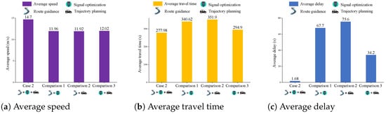 The comparative results of Case 1, as shown in Figure 9, demonstrate that the proposed integrated optimization framework outperforms the three comparison scenarios in terms of average speed, travel time, and delay. This improvement is attributed to the integrated optimization of vehicle routes, traffic signals, and vehicle trajectories. First, the effectiveness of the trajectory planning module is evident when compared to Comparison Scenario 1. In Comparison Scenario 1, vehicles often experience sudden decelerations when encountering red lights, which reduces ride comfort and increases travel delays. The absence of a trajectory planning module leads to a 14.91% decrease in average speed, a 16.7% increase in average travel time, and a 393.59% increase in average delay. Next, the benefits of the signal optimization module are revealed in comparison with Comparison Scenario 2. In this scenario, traffic signal controllers follow the initial signal plan without adjusting signal timings based on vehicle movements. This results in a 39.70% reduction in average speed, a 61.45% increase in average travel time, and a 1547.44% increase in average delay, highlighting the importance of signal optimization. Finally, the advantages of the route guidance module are explored in comparison with Comparison Scenario 3. In this scenario, vehicle routes are not updated, leading to a 4.47% decrease in average speed, a 2.53% increase in average travel time, and a 196.15% increase in average delay. This underscores the benefit of dynamic route guidance in improving traffic efficiency in the urban road network.