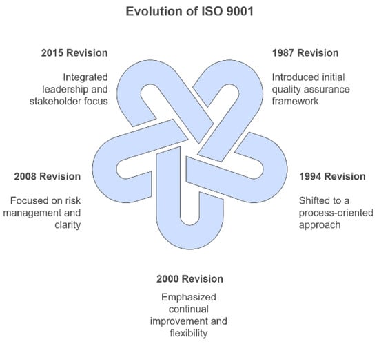 In today’s business environment, Quality Management has become a cornerstone for organizations striving to remain competitive and deliver products or services that consistently meet customer expectations, particularly when competing in international markets [1]. Within this context, the ISO 9001 standard has emerged as one of the most widely adopted international standards for the implementation, documentation, and maintenance of Quality Management Systems (QMSs) worldwide [2]. Developed by the International Organization for Standardization (ISO) at www.iso.org, this standard not only provides a reference framework to ensure quality but is also grounded in continuous improvement and operational efficiency—key factors that contribute to organizational sustainability and success. Since its initial publication, the standard has undergone multiple revisions and updates (1987, 1994, 2000, 2008, and 2015, Figure 1) to adapt to the demands of globalized markets. This evolution has positioned ISO 9001 as an indispensable tool in the pursuit of operational and administrative excellence [3].
