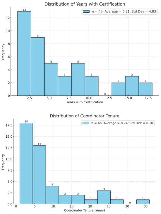 The next variable analyzed pertains to the tenure of the quality coordinator, understood as the experience of the individual responsible for the QMS. On average, QMS coordinators have six years of experience. When compared with the descriptive statistics of the variable “QMS Age”—measuring the years since the certification was obtained—it is observed (see Figure 6) that organizations generally assign existing staff members to oversee the quality system, as their tenure surpasses the average lifespan of the QMS itself.