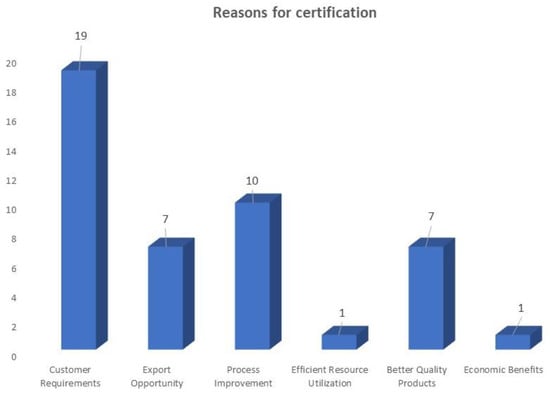 The subsequent variable, “Reason for Seeking Certification”, seeks to uncover the motives driving organizations to design and implement a QMS. The distribution of frequencies describing the identified reasons is displayed in Figure 7.
