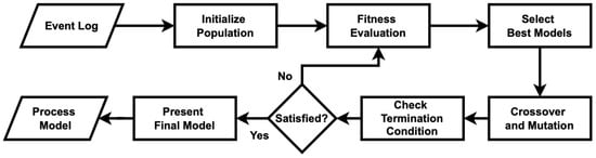 Inspired by evolutionary principles, GPM refines a population of candidate process models over successive iterations to identify the one that best aligns with the observed event data [2]. As presented in Figure 1, the algorithm begins by initializing a diverse set of process models, which are then evaluated using a fitness function that measures their correspondence with the event log. Through genetic operations such as selection, crossover, and mutation, new models are generated, inheriting characteristics from high-performing models while exploring alternative structures. This iterative process continues until a stopping criterion is met, such as reaching a predefined number of generations or achieving a satisfactory fitness score.