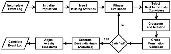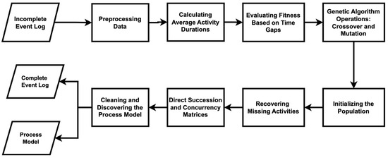 Several studies have investigated the application of GPM for missing data recovery. Ref. [11] introduced a genetic algorithm-based process discovery framework that reconstructs process models by optimizing fitness scores relative to observed event traces. Similarly, ref. [13] extended GPM with time-based analysis, enabling the recovery of missing activities by considering dual timestamps (start and end times). However, a common limitation of standalone GPM is its computational overhead, as evaluating multiple generations of process models requires significant processing time. Nonetheless, such approaches still face challenges in ensuring the soundness and precision of the discovered process models, as GPM alone does not explicitly enforce structural correctness. Therefore, integrating GPM with other process discovery techniques has been a focus of recent research to enhance its efficiency and accuracy while maintaining computational feasibility.