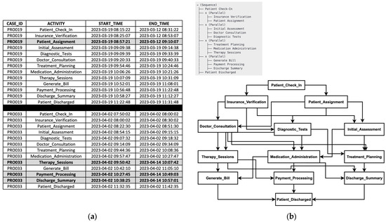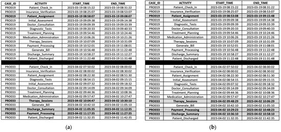 Unlike traditional process mining approaches that rely solely on a single timestamp, TGIPM leverages dual timestamps (start and end times), which are now commonly stored in modern enterprise databases. Timestamp information recorded in event logs plays a crucial role in uncovering meaningful insights into business process performance and behavior through process mining techniques [45,46]. Most contemporary systems, such as Enterprise Resource Planning (ERP), business process management (BPM), and Hospital Information Systems (HIS), generally track both start and end times for process monitoring, compliance, and optimization. The availability of dual timestamps enhances TGIPM’s ability to reconstruct event sequences, ensuring accurate activity recovery and improving conformance checking.