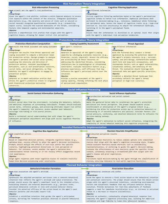 Our agent architecture, informed by the theoretical underpinnings outlined in Section 3, is designed to translate complex psychological constructs into computational steps that guide agent decisions. This architecture leverages prompt engineering techniques, ensuring that each decision-making layer aligns with the established theories of risk perception, protection motivation, social influence, bounded rationality, heuristics and biases, and planned behavior.