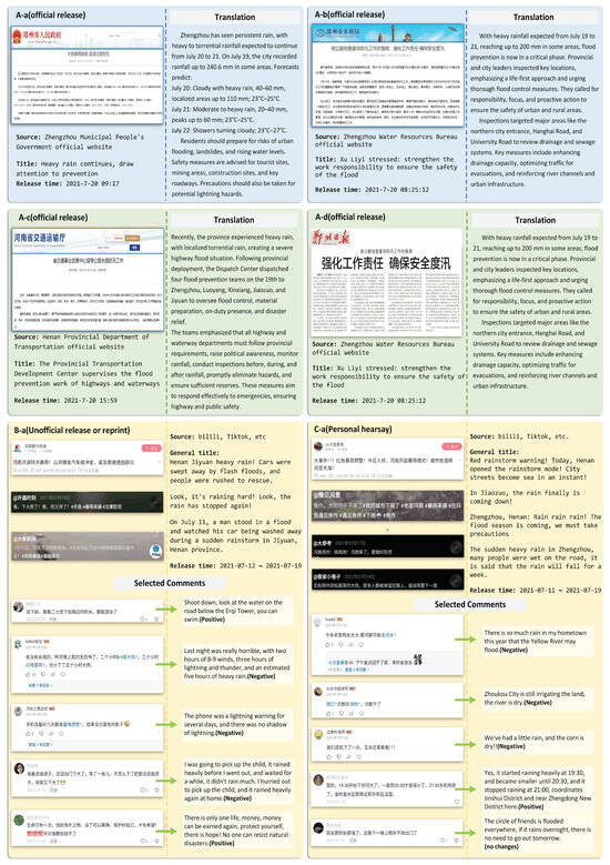 The case study is grounded in the catastrophic flooding that struck Henan Province, China, in July 2021. In the provincial capital, Zhengzhou, extreme rainfall exceeding 600 mm over a short period led to severe urban inundation, reservoir failures, and widespread infrastructure damage []. More than 14.78 million people were affected, with direct economic losses exceeding RMB 120.06 billion. Approximately 95.5% of the casualties occurred in Zhengzhou alone, underscoring the localized severity of the disaster. During this crisis, residents relied on multiple sources of information—official weather alerts, government broadcasts, mainstream media, and social media—often characterized by delays, inconsistencies, or uncertain credibility. Building upon this, we devise a virtual flood scenario mirroring the complex information ecosystem. Such complexity, as is shown in Figure 5, marked by uncertain information flows, credibility dilemmas, and high-stakes decisions, provides an ideal testbed for examining whether our LLM-driven agents can emulate the cognitive and social nuances observed in human responses to emergencies.