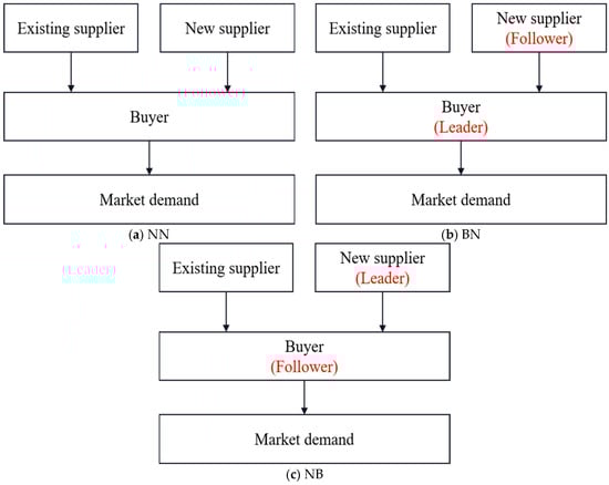 Figure 1. Illustration of three different scenarios: (a) buyer and new supplier make decisions at same time; (b) buyer as leader; (c) new supplier as leader.