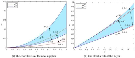 e N S N N e N S N B = β 4 h 4 2 h 4 β 4 + K k 16384 K k 384 h 2 β 2 , 16384 K k 384 h 2 β 2 > 0 , where can be obtained e N S N N < e N S N B . From this, we can infer e N S B N > e N S N B > e N S N N . From this, we can infer e N S B N > e N S N B > e N S N N . The effort level of the buyer in the three scenarios is compared as follows: e B B N = e B N B e B N N = 4 β 3 h 3 k h 4 β 4 192 K h 2 k β 2 + 8192 K 2 k 2 > 0 . From this, we can infer e B B N = e B N B > e B N N . □
