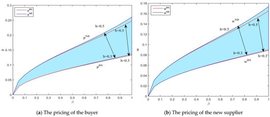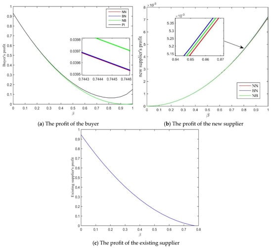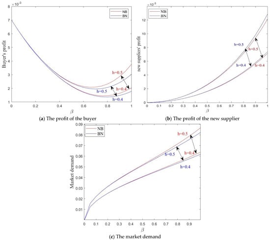 The profit of the buyer in the three scenarios is compared as follows: Π B B N Π B N B = 1 8 h 4 k β 4 h 2 β 2 + 64 K k 2 > 0 Π B N B Π B N N = 1 8 h 6 k β 6 h 2 β 2 + 64 K k h 2 β 2 + 128 K k 2 > 0 . From this, we can infer Π B B N > Π B N B > Π B N N . The profit of the new supplier in the three scenarios is compared as follows: Π N S B N Π N S N B = 1 8 h 4 k β 4 h 2 β 2 + 64 K k 2 < 0 , Π N S B N Π N S N N = 32 h 4 k 2 β 4 K h 2 β 2 + 64 K k h 2 β 2 + 128 K k 2 > 0 . From this, we can infer Π N S N B > Π N S B N > Π N S N N . □