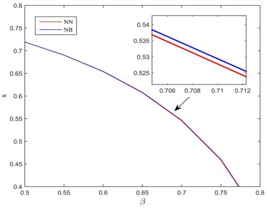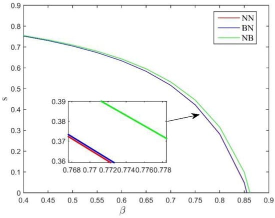 In the NN scenario, when s N N > s 1 , the buyer’s effort level is higher than that of the existing supplier. In the NB scenario, when s N B > s 2 , the buyer’s effort level is higher than that of the existing supplier. In the BN scenario, when s B N > s 3 , the buyer’s effort level is higher than that of the existing supplier, and s 2 = s 3 > s 1 , where s 1 = D h 2 β 3 + h 2 D 4 c β 2 + 128 D K k β 128 K k D 2 c h 2 β 2 + 128 K k β 1 D , s 2 = D h 2 β 3 + h 2 D 4 c β 2 + 64 D K k β 64 K k D 2 c h 2 β 2 + 64 K k β 1 D , s 3 = D h 2 β 3 + h 2 D 3 c β 2 + 64 D K k β 64 K k D 2 c h 2 β 2 + 64 K k β 1 D .