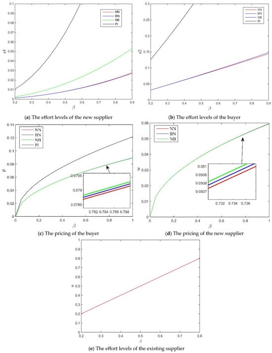 Proposition 1 (i) suggests that for the new supplier, the level of effort in DTCI is higher when acting as a follower compared to when leading. This is attributed to the new supplier’s relatively weaker grasp on market positioning and future development directions compared to the buyer [8], which would exacerbate the uncertainty of DTCI success under the new supplier’s leadership. Moreover, from the equilibrium solutions (e.g., e 1 N B and e 2 N B ), it is evident that the new supplier’s effort level in DTCI is more sensitive to the probability of success ( h and β ) than the buyer’s. Hence, the new supplier exerts a higher level of effort in DTCI when the buyer leads. Interestingly, whether the buyer or the new supplier leads has no impact on the buyer’s effort level in DTCI. This is because the buyer, with their established and stable technology through their existing supplier relationships, primarily aims to explore new markets and possibilities with DTCI. Whichever party leads, this represents an opportunity for the buyer to experiment with DTCI efforts. Furthermore, the buyer can always revert to the existing mature technology if the DTCI with the new supplier does not succeed. For example, although Apple’s innovation attempt with GTAT to produce sapphire screens failed, they continued to cooperate with their existing supplier, Corning, to produce regular screens for their iPhones (as opposed to sapphire screens) [8]. As for the existing supplier, having already established production scales and supply chain systems enables them to achieve certain economies of scale. In this context, to reduce production costs further, they would need a significant investment or transformation, which may not be desirable for them. Additionally, as traditional products have been on the market for a considerable time and competition among suppliers is relatively fierce, it is challenging to gain a significant advantage through price competition; thus, the effort levels among existing suppliers tend to remain consistent.