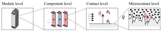 | Microcontact level | Microscopic fluid-wall heat transfer | Separate or collect energy | In: Volume flow, heat flow; Out: Volume flow | Surface roughness and wetted fluid | Convection on roughness |