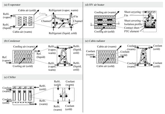 | Evaporator | Condenser | Chiller | HV air heater | Cabin radiator * | HV coolant heater | HV battery | DC/DC Converter | HV compressor | Oil-coolant heat exchanger | Inverter | On-board charger | Electric motor | Gearbox | * is equal to the low-temperature radiator and battery coolant radiator |