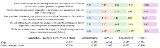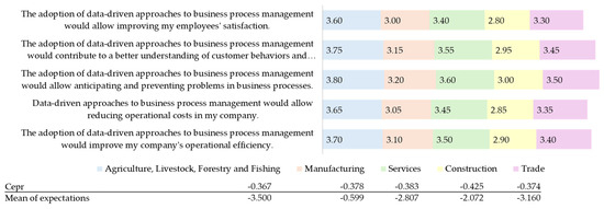 The study of expectations in the context of the adoption of data-driven approaches for business process management, especially in small and medium-sized enterprises (SMEs), emerges as a critical component to understand and facilitate the successful implementation of these technologies. From multiple theoretical and empirical perspectives, several authors agree in emphasizing that expectations not only act as key mediators between prior experience and adoption intention [40] but also configure fundamental constructs to predict both the intention to use and the actual adoption behavior [41,42]. Table 5 presents some of these perspectives.