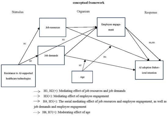 Based on the above discussion, this study proposes that there exists a mutual relationship between job resources, job demands, and employee engagement. It also suggests that the link between AI-supported healthcare technologies and AI adoption behavioral intentions should be mediated through a serial mediation model involving job resources, job demands, and employee engagement. In this model, job resources and job demands enhance engagement, which in turn influences healthcare professionals’ AI adoption behavioral intentions toward adopting AI-supported healthcare technologies. Additionally, it is proposed that age moderates the relationship between job resources, job demands, and resistance to AI-supported healthcare technologies, ultimately affecting AI adoption behavioral intentions. This is illustrated in Figure 1, with hypotheses H1 to H7 used as the proposed models.