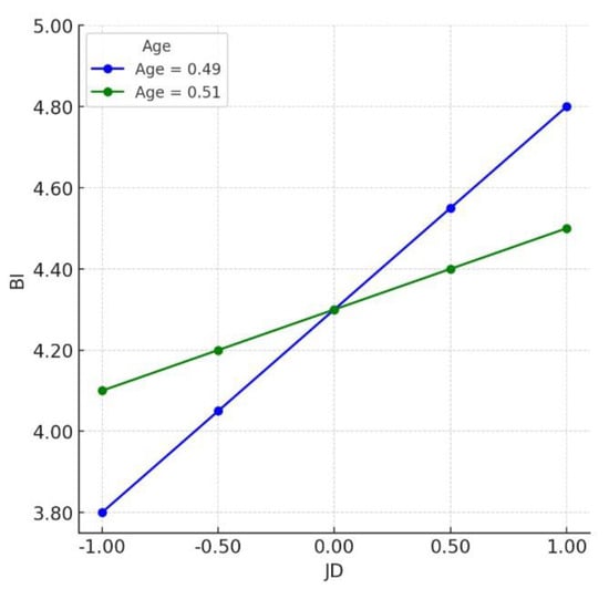 H6 and H7 assume that age moderates the role of job resources and job demands in the relationship between resistance to AI-supported healthcare technologies and AI adoption behavioral intentions. The analysis of the results indicates that job resources and job demands exhibit indirect effects on resistance to AI-supported healthcare technologies and AI adoption behavioral intentions. The moderating influence of job resources on the relationship between resistance to AI-supported healthcare technologies and AI adoption behavioral intentions is not significant with the moderation of age (B = −0.093, SE = 0.067, CI = −0.23, 0.031). Thus, H6 is not supported. However, there is a significant negative moderating influence of job demands on the relationship between resistance to AI-supported healthcare technologies and AI adoption behavioral intentions with the moderation of age (B = −0.158, SE = 0.07, CI = −0.297, −0.021), shown in Table 5 and Figure 2. Thus, H7 is supported.