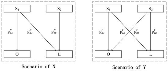 This paper develops a game-theoretic model with two types of crab suppliers: marine and inland saline–alkali. Drawing on contextual dependence [43] and regional heterogeneity [44,45], the model considers two independent markets: coastal (O) and inland (L), where cross-purchasing is not possible [49].
