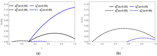 The impact of consumer quality preference on saline–alkali crab quality is illustrated in Figure 2. When is low, supplier actively supplies inland saline–alkali crabs; however, when and search costs are high, market entry depends on specific conditions. As shown in Figure 2a, when , supplier benefits from a cost advantage, and market encroachment stimulates quality improvements. For example, in the Zhoushan hairtail and Pacific white shrimp markets, live streaming and traceability reduce search costs, encouraging suppliers to enhance quality. Conversely, when , market encroachment suppresses quality improvements. Figure 2b demonstrates that when is high and a is low, increased quality costs do not significantly enhance consumer utility. In such cases, supplier prioritizes market share over quality improvements. However, when a is high, consumers are more adept at perceiving product differences, making quality improvements a crucial competitive strategy. The effect of on quality follows a “promotion-then-suppression” pattern. Initially, when consumers are unfamiliar with a product or brand, quality has a limited impact on their purchasing decisions, which explains their preference for established brands. To gain a competitive edge, saline–alkali crab suppliers must focus on not only enhancing quality through technological innovations but also on strengthening brand visibility.