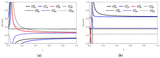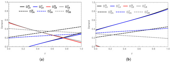 The relationship between differentiated product demand and flavor preference differences is shown in Figure 7. When is low, price fluctuations lead to greater demand volatility. As increases, demand becomes more stable. As illustrated in Figure 7a, with low search costs (), demand for marine crab initially rises rapidly before stabilizing regardless of whether inland saline–alkali crabs enter the market. In contrast, inland saline–alkali crab demand drops sharply before leveling off. When (Figure 7b), the demand trends reverse, with price becoming a more significant factor in consumer choice. Without market encroachment, inland saline–alkali crab suppliers cannot enter coastal markets (), leaving marine crab demand unaffected by . However, with market encroachment, demand is redistributed; some previously undecided consumers shift to marine crab, while others switch to inland saline–alkali crab. This scenario mirrors the Zhoushan hairtail market, where branding and regional identity enable product entry into new markets, highlighting the importance of flavor differentiation and strategic market positioning. According to utility function (1), potential consumers exist in incomplete markets, where product differentiation reshapes market dynamics. As a increases, consumers become more sensitive to price, leading to a reduction in overall demand. However, strong brands are able to capture a larger market share, highlighting the importance of brand effects in driving demand shifts. These brand effects help to mitigate the impact of price fluctuations, ultimately enhancing competitiveness in differentiated markets.