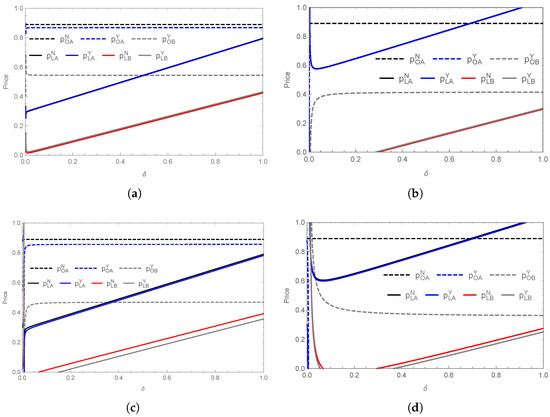 - In the coastal market, the relationship between the prices of the two products and δ is as follows. If , then ; otherwise, . If and or if and , then ; otherwise, .
