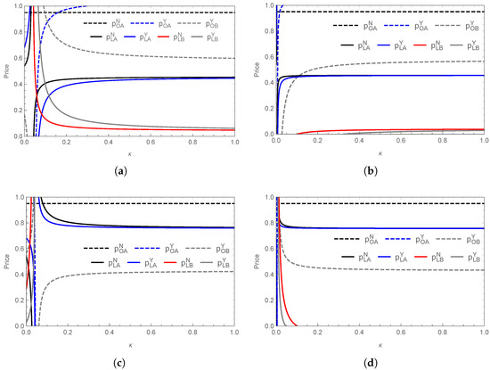 Figure 9 depicts the pricing and technological input cost , confirming Corollaries 1 and 7. In scenario N, is unaffected by . However, in scenario Y the prices of and are significantly influenced by . Information search moderates the effect of on marine crab pricing cost a. When a is low (Figure 9a,b), consumers can more easily access information on product quality, leading to a sharp price increase for marine crab, which subsequently stabilizes. This suggests that aligning prices with market positioning strengthens pricing power. Conversely, when a is high (Figure 9c,d), marine crab prices initially decline before stabilizing due to high search costs, which reduces consumer utility and limits pricing flexibility. The pricing of saline–alkali crabs is jointly influenced by and a. When both parameters are either low (Figure 9a) or high (Figure 9d), prices exhibit a “rise–fall–stabilization” pattern. When and a diverge (Figure 9a,c), prices initially rise before stabilizing as increases, emphasizing the role of differentiation strategies in price adjustments.