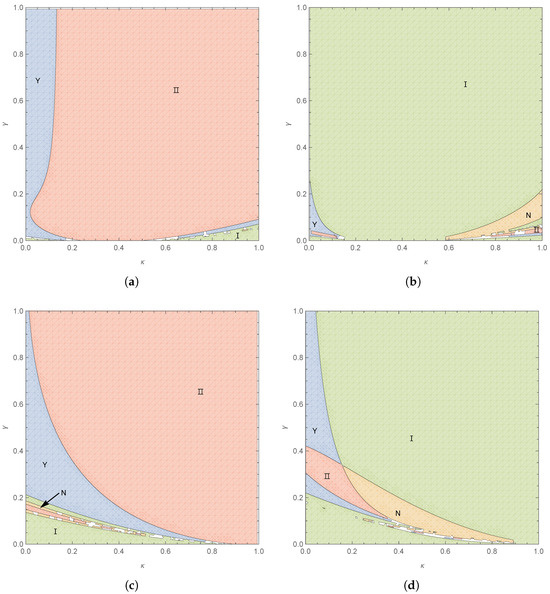 The equilibrium strategies for consumer quality preference and technological input cost coefficient in hybrid markets: (a) , ; (b) , ; (c) , ; (d) , .