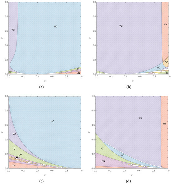 Figure 11 and Figure 12 illustrate notable shifts in optimal supplier strategies under hybrid market conditions, although the strategic boundaries remain largely consistent. Here, N, Y, and C represent Pareto-optimal strategies, while other outcomes indicate suboptimal strategies; for instance, NC refers to a scenario in which supplier selects N and supplier chooses C, with similar notations used for other cases. When consumer sensitivity to quality is high, supplier prefers scenario N, while supplier transitions from Y to C. Advanced logistics and e-commerce platforms significantly reduce market entry costs in the hybrid market scenario, enabling suppliers to invest more in quality improvements. Unlike traditional regional markets, which necessitate substantial market penetration efforts, hybrid markets have lower entry barriers, allowing suppliers to prioritize quality enhancements and strategic optimization. This reduces the costs for new entrants and provides them with a stronger competitive position.