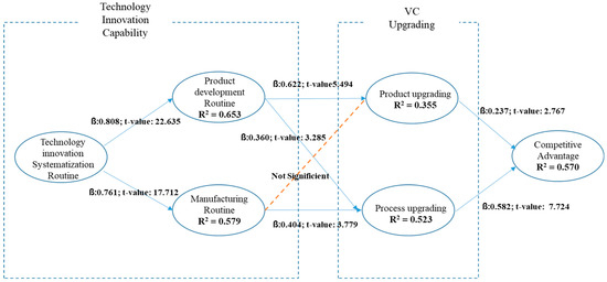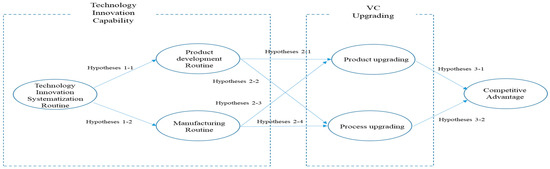 The model for this study is designed to explore the relationships among technological innovation capabilities, value chain upgrading, and competitive advantage enhancement in SMEs. In this model, technological innovation capabilities consist of technological innovation systematization routines (TISRs), product development routines (PDRs), and manufacturing routines (MRs). Value chain upgrading includes product upgrading and process upgrading.