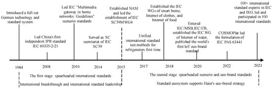 Haier’s TSIE evolved in two distinct stages (Figure 2). The initial stage transitioned from a high-standard brand strategy to an international standard breakthrough, culminating in a standard-led global brand strategy. This period was characterized by Haier’s commitment to high-quality and rigorous standards, solidifying its technical foundation. In 1984, Haier introduced a full set of German technology and standard systems to improve product quality. Furthermore, Haier actively engaged in setting international standards through technology and standard innovations based on the assimilated knowledge and technology. A significant milestone was achieved in 2008 when Haier spearheaded IEC 60335-2-21, marking China’s first independent intellectual property rights for home appliances. Subsequently, leveraging technology standards in niche fields and a strategic global patent layout, Haier led the formulation of the IEC 62514 digital home international standard, led the establishment of the IEC TC59/SC 59M WG4 refrigerator preservation international standards work group, and played a pivotal role in developing relevant international standards. This trajectory epitomizes the metamorphosis from “advanced products to advanced technology to advanced standards”.