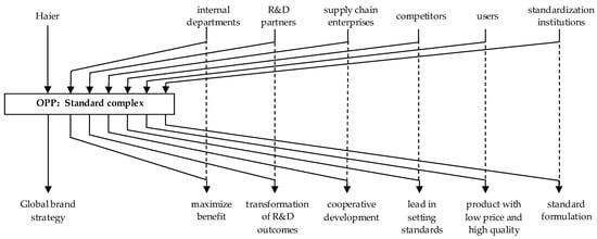 1. Problematization: Set up the OPP of the standard complex. The primary objective of problematization is to elucidate the problems that necessitate the creation of an actor network, identify the primary actors involved, and set up the OPP for each actor. Firstly, the focal actors must determine the primary actors based on the purpose of the network. Haier’s development trajectory has gradually delineated its strategic goals, which include catching up with and leading international standards. That is, “go out through standards, drive technology advancement, foster brand and product recognition, and layout the global market with standards” (C03). Then, Haier preliminary identified the network actors, encompassing internal departments, R&D partners, supply chain enterprises, competitors, users, and standardization institutions. Secondly, obstacles encountered by each actor are identified. The improvement of quality and standards within Haier will inevitably impose new requirements for employees, disrupt the established systems, and potentially affect individual interests. Consumers prioritize products that offer safety and quality assurance to meet their needs, and raising standards often results in higher prices. If supply chain enterprises fail to align with Haier’s improved standards, they risk being phased out, and corresponding changes inevitably lead to increased costs. Competitors focus on leading in setting standards by advanced technology, thus they have competitive relationships with Haier. R&D partners concentrate on the transformation of research outcomes and the distribution of benefits. Standardization institutions tend to prioritize standard formulation over their practical application. Finally, determining the OPP involves determining the value of the OPP to each actor and transforming it into an obligatory point for realizing their own goals, thereby conflicts among heterogeneous actors are resolved. For this purpose, Haier identified “establishing a standard complex” as an OPP, as shown in Figure 3.
